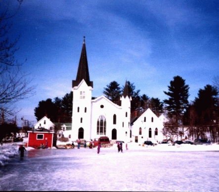| The town of Newport is one of those quaint little New England townships that are always on the postcards that you buy in the tourist shops. It is located on the western side of the state and is even by New Hampshire standards tiny. The village center is the site of their annual winter carnival. Here you can see some of the townspeople skating on the frozen over town common. The small red building at the left is a skate rental shop operated by the town. |