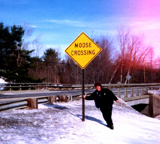 | Glenys loved seeing the signs that said moose crossing...she said "What is the matter with them....here they are promising me moose and never delivering." I had to admit that we never did see any moose in all of our travels. But the sign sure made a nice spot to take a photo of Glenys. |
