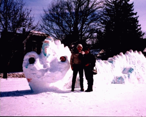 | Some of the things that you can expect to see at a winter carnival are snow and ice sculptures. Here Glenys and I are standing in front of a snowsculpture in the shape of a dragon. The whole of it is about 18 feet in lenght and has a height of 7 feet at it's highest. The sculptor took our picture with his creation and told us that it took him several weeks to create this masterpiece. |