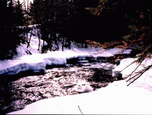 | The road back from Newport is lined by many small brooks and streams. There was one spot in particular that seemed to fascinate Glenys. This is where the moose crossing photo was taken. The stream that is in this photo wanders back and forth under the road and offers lovely views like this all along it's course. The risk in taking a photo this close to the brook is that you can never tell where the shore ends and the ice above the water begins. By the time you have discovered that you have gone too far you are hip deep in freezing cold water. |