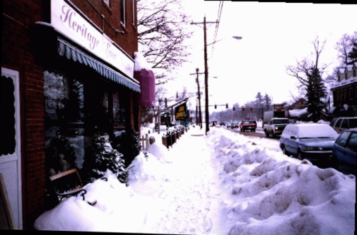 | By late afternoon we decided we were ready to brave the elements again and go explore the local shops. The footpath had been plowed earlier in the day and snow was piled high on both sides so you felt like you were walking in a narrow white valley. |