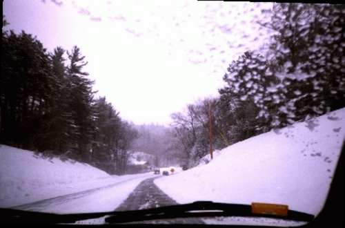 | I had promised to take Glenys back to North Conway to see how much things differ there between fall and winter and as can be expected it started snowing while we were on the way. She was thrilled to be driving along with the swirling snow flying all around us giving the whole of the drive a magical air. As can be easily seen, the snowplows had not been able to clear the road and it was just the passing of the cars that kept the paths clear. And while I was complaining about the poor visability she was happily snapping away with her camera. |